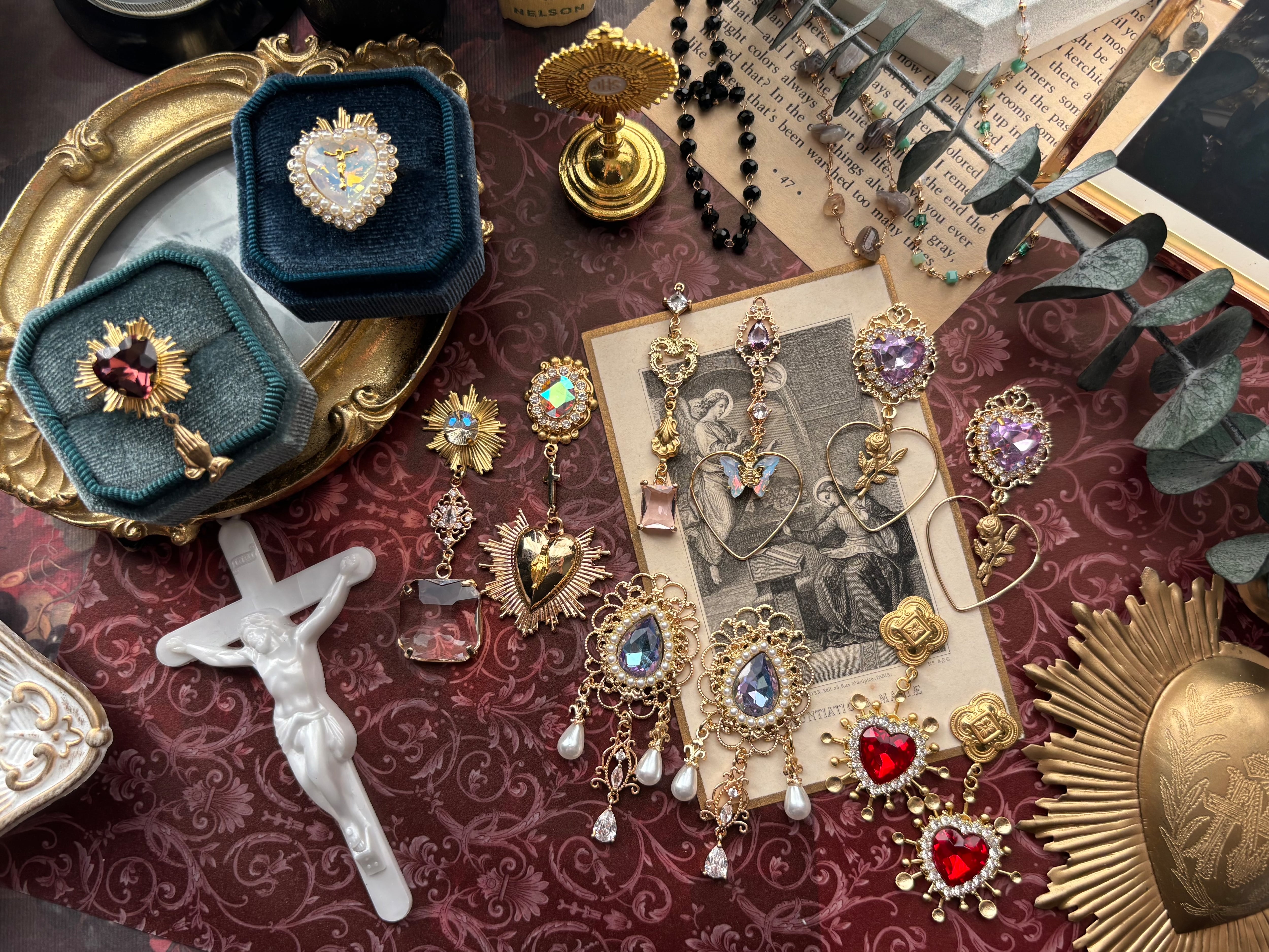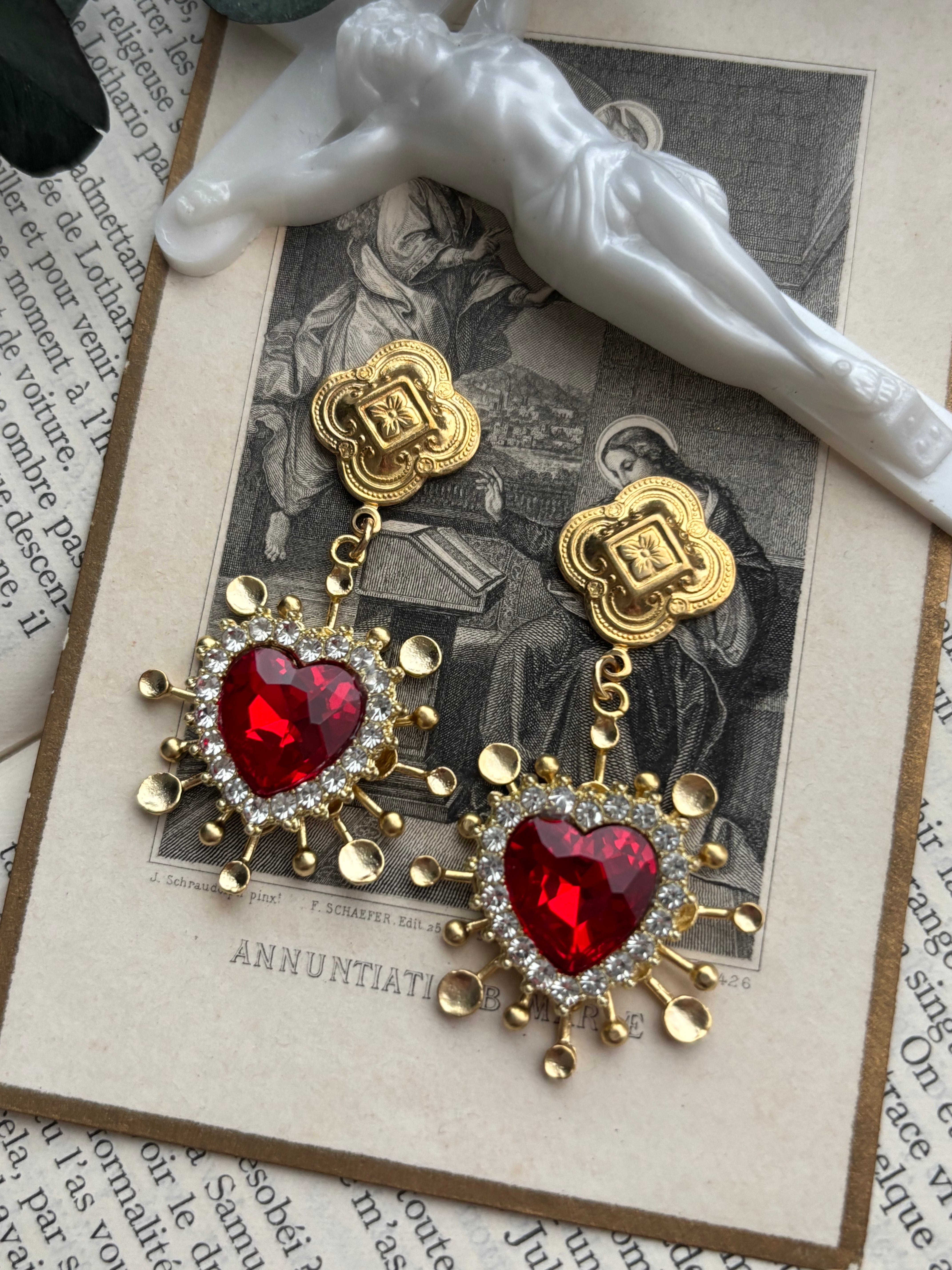 後光のモチーフに真っ赤なハートをあしらった耳飾りです
