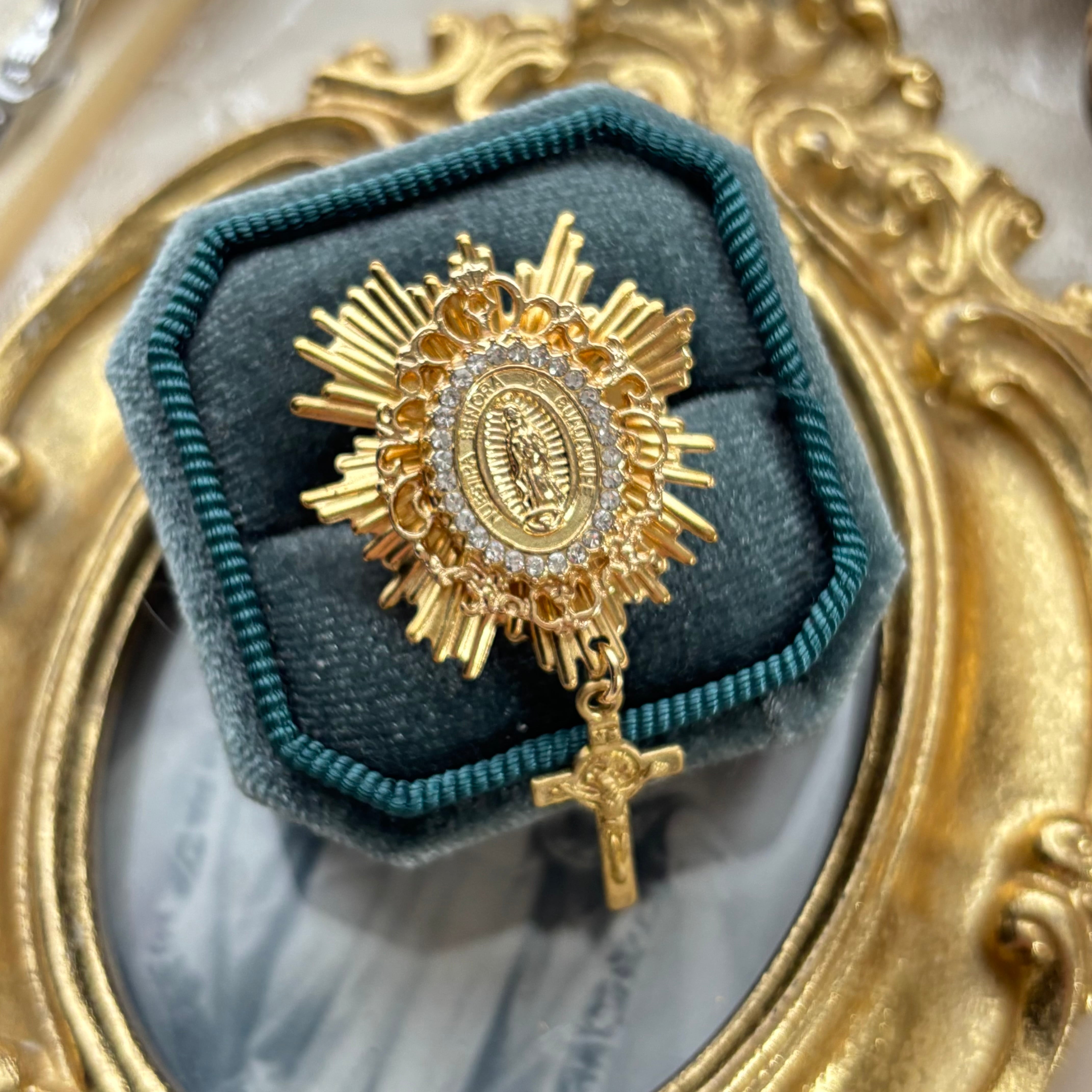 煌びやかなメダイと十字架チャーム揺れる指輪です