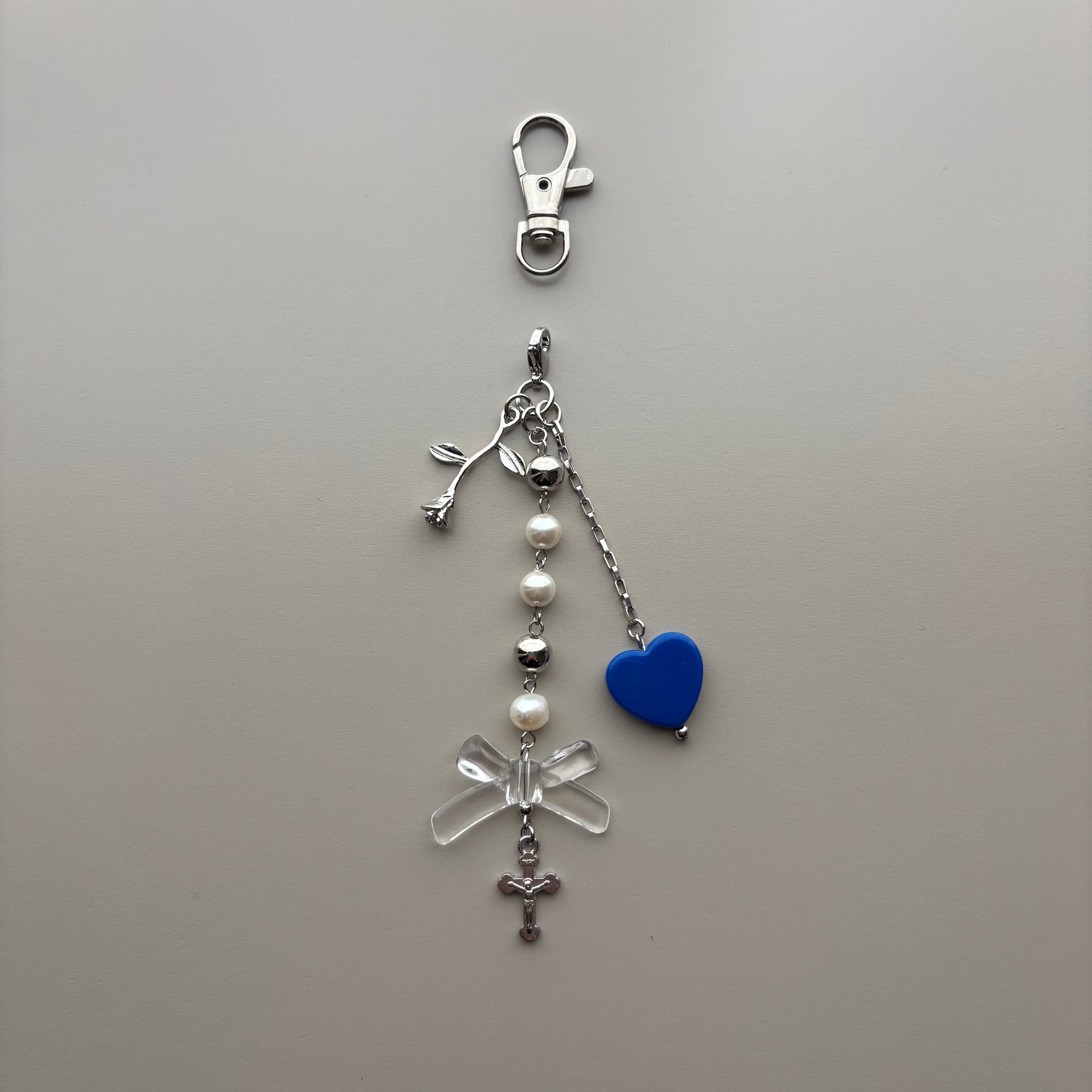 透明リボンと小粒パールを並べ、最後にクロスを添えたミニロザリオ風デザイン。