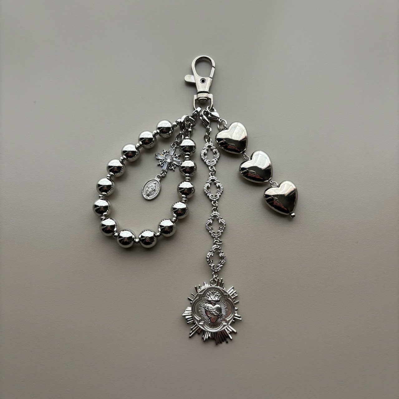 大粒のシルバービーズと立体的なハートモチーフが連なる、存在感のある祈りのチャーム。