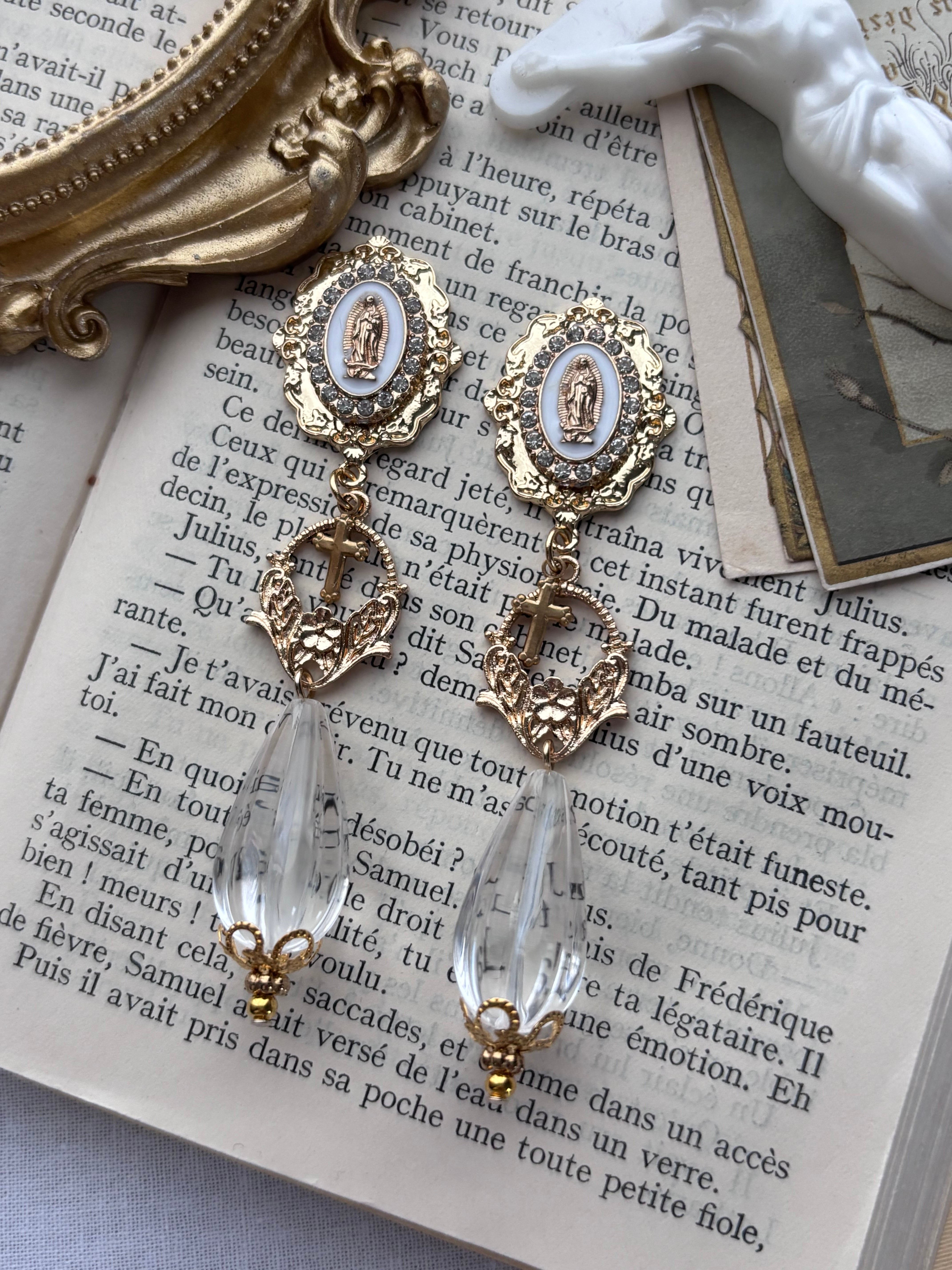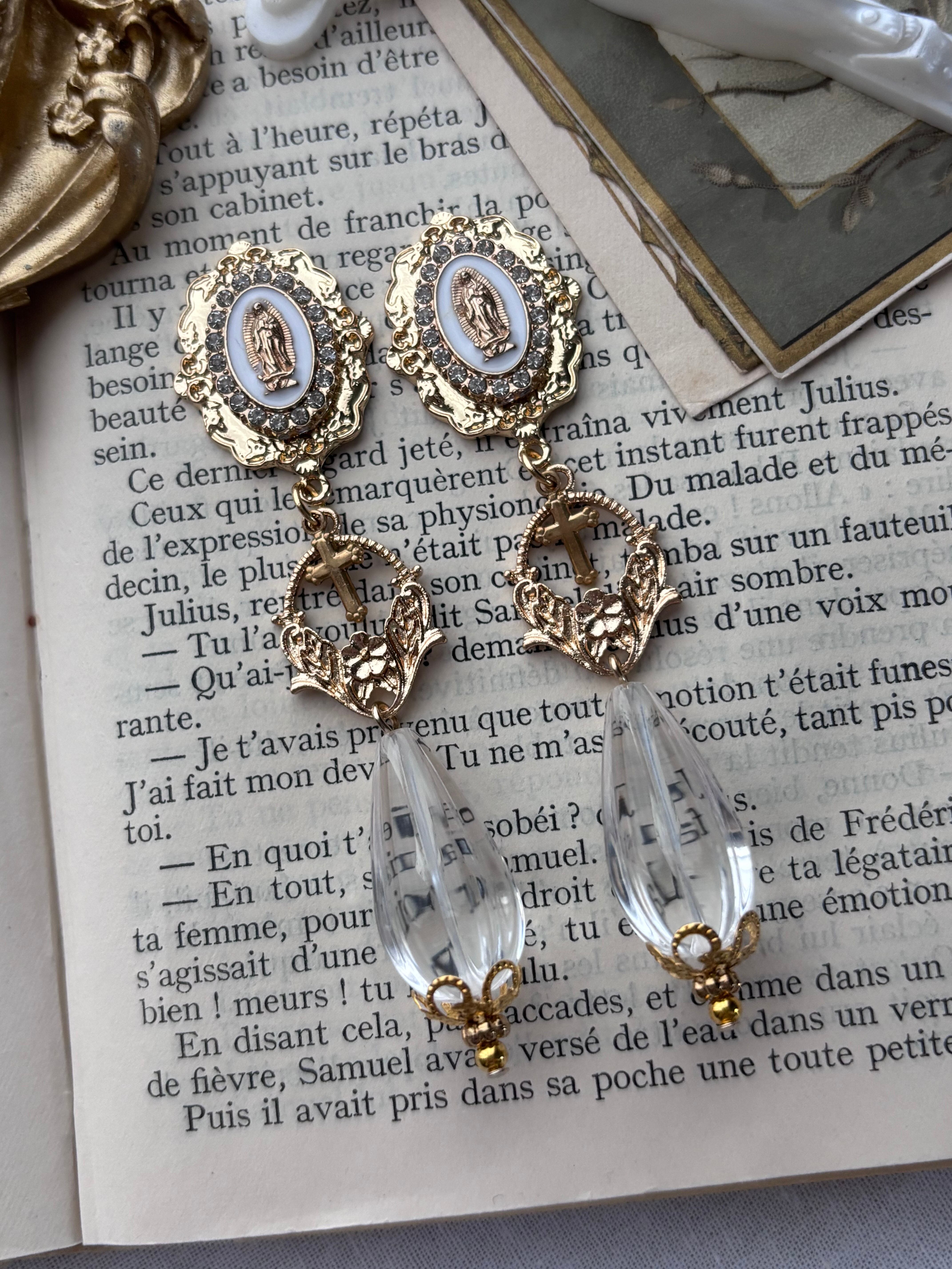 白いメダイと透明な雫のビーズの耳飾りです
