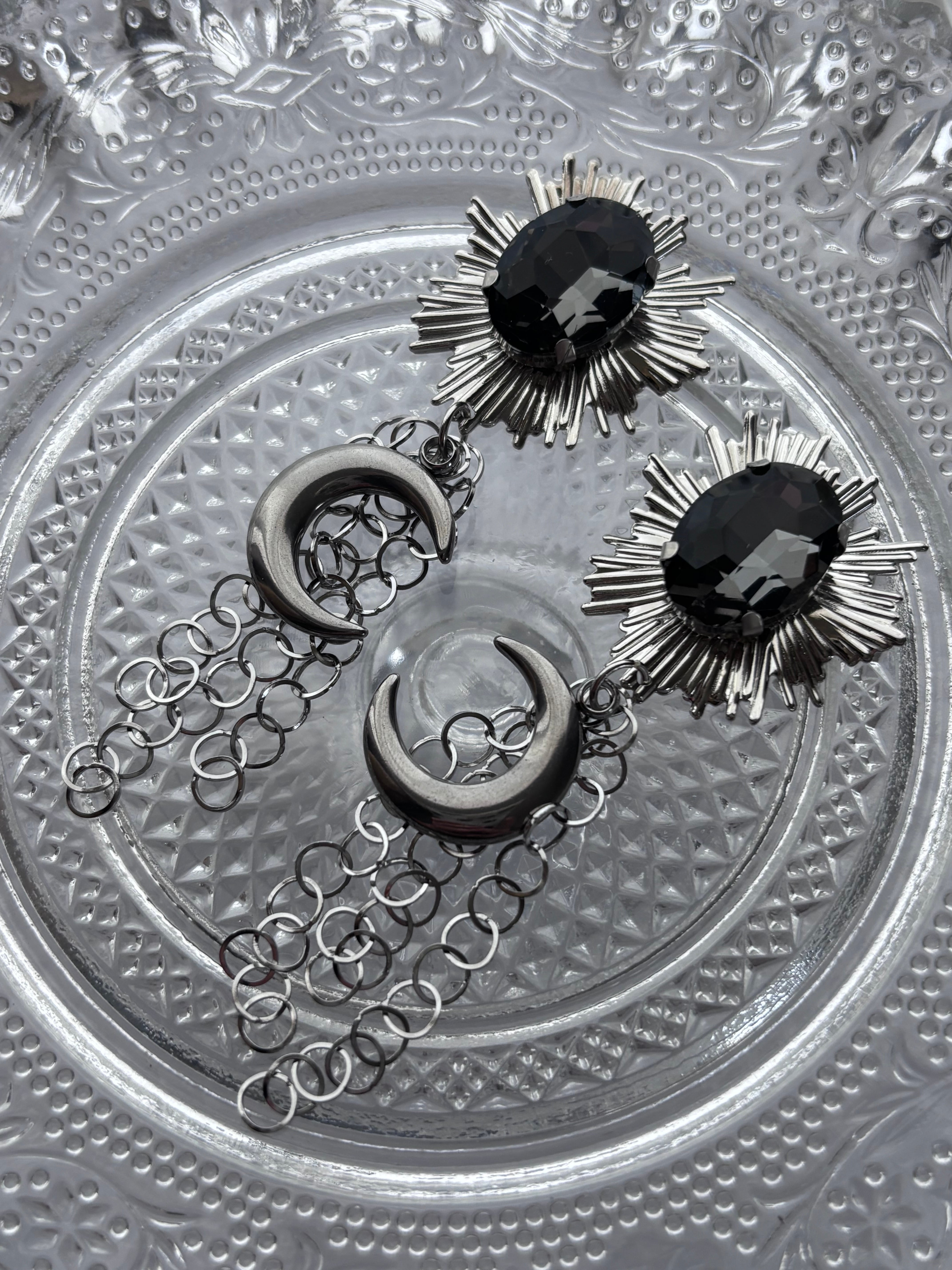 黒いガラスのカボションと三日月の耳飾りです