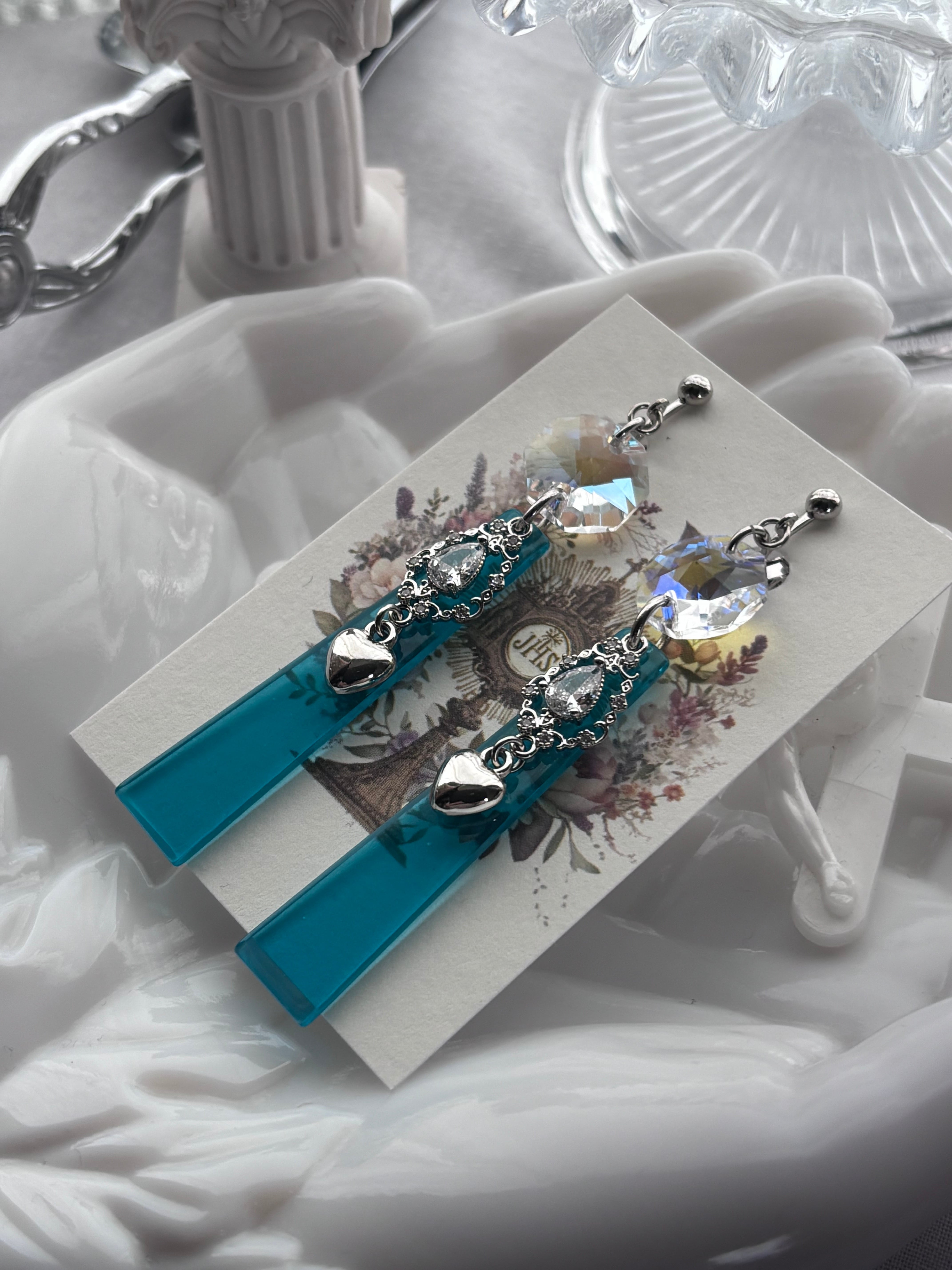透明感あるブルーのアクリルチャームが揺れる耳飾りです