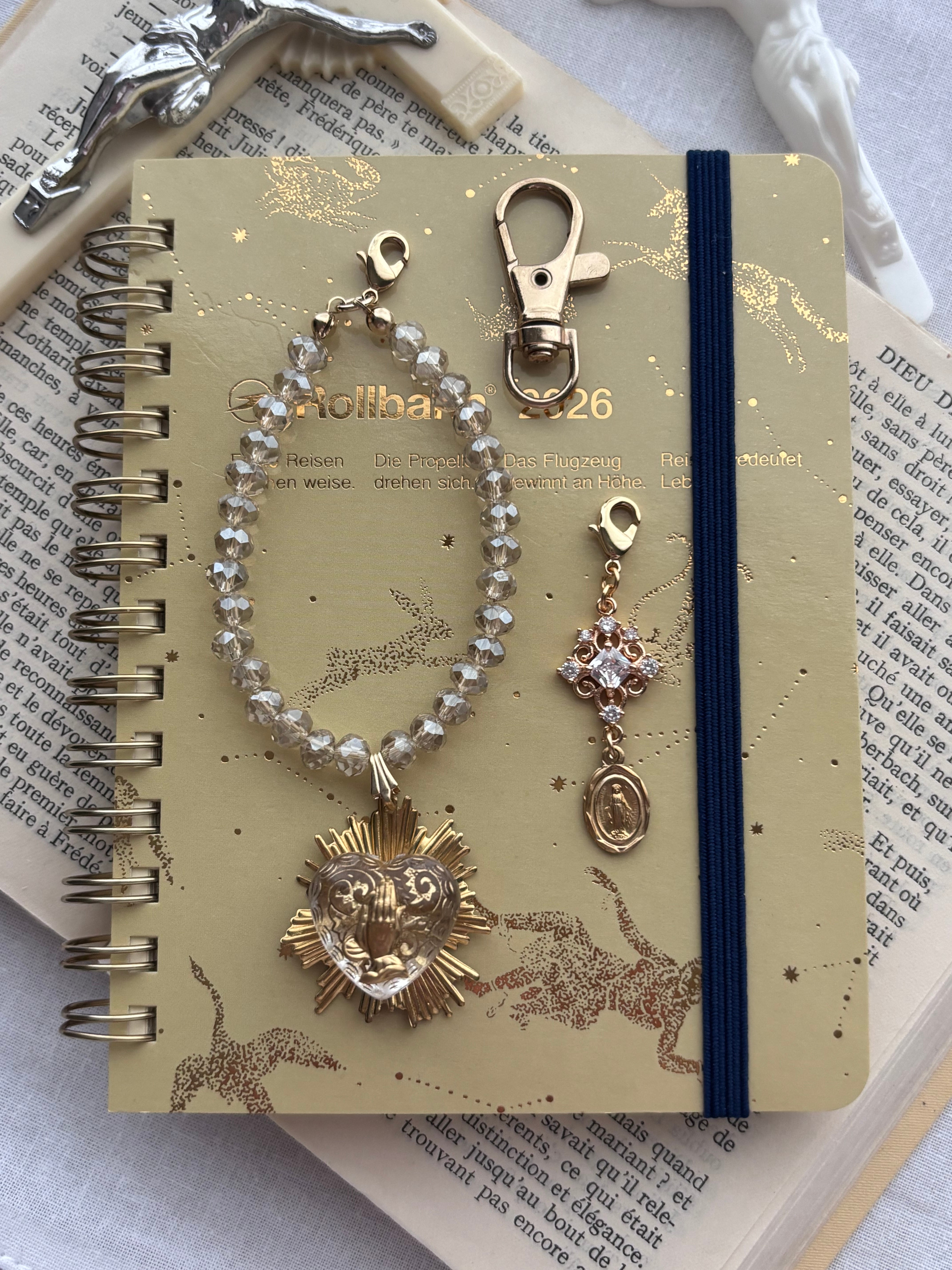 アンティークカラーが美しいガラスビーズを使用し、チャームはハートに祈りの手をあしらいました