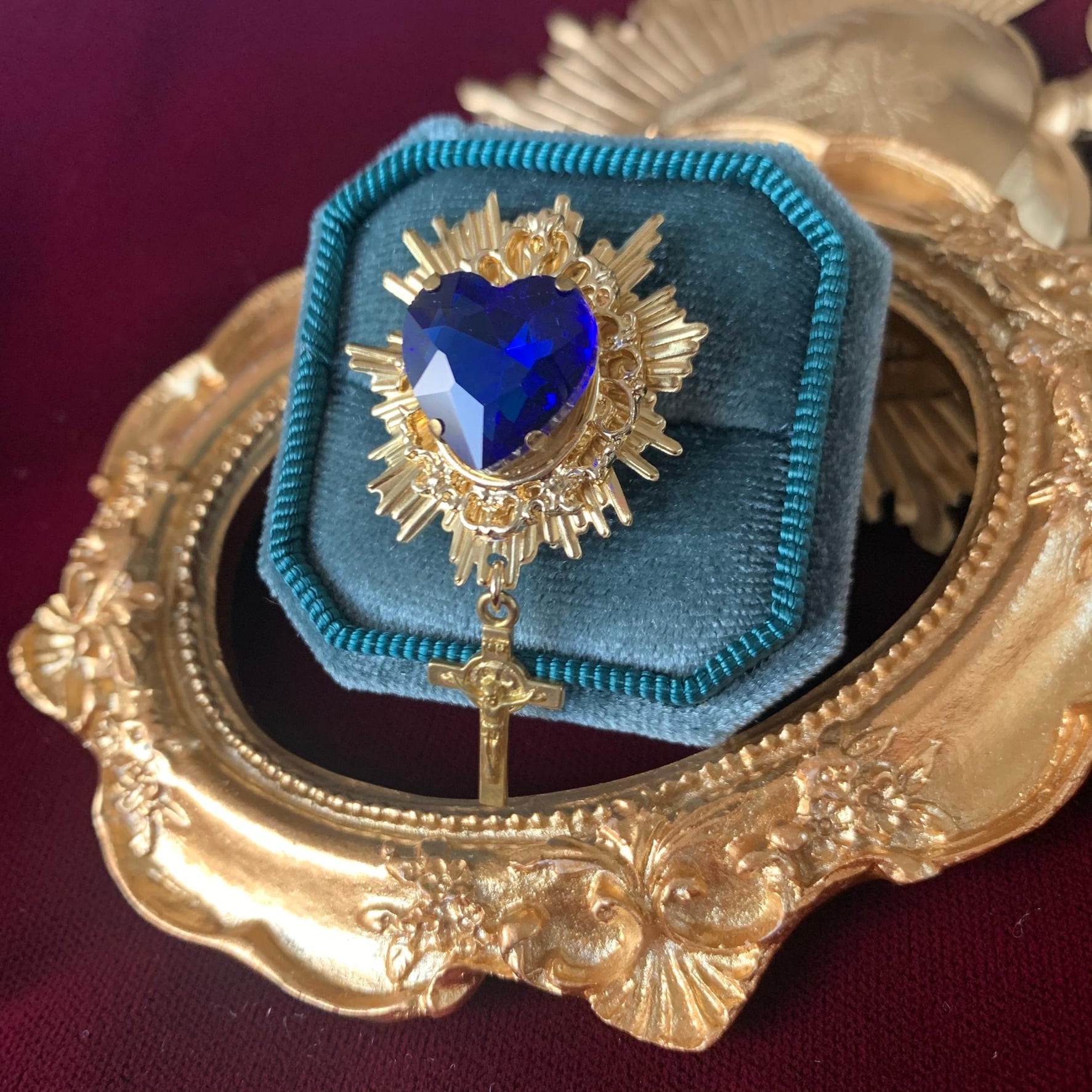 ハートのガラスストーンと十字架ゆらめく指輪です