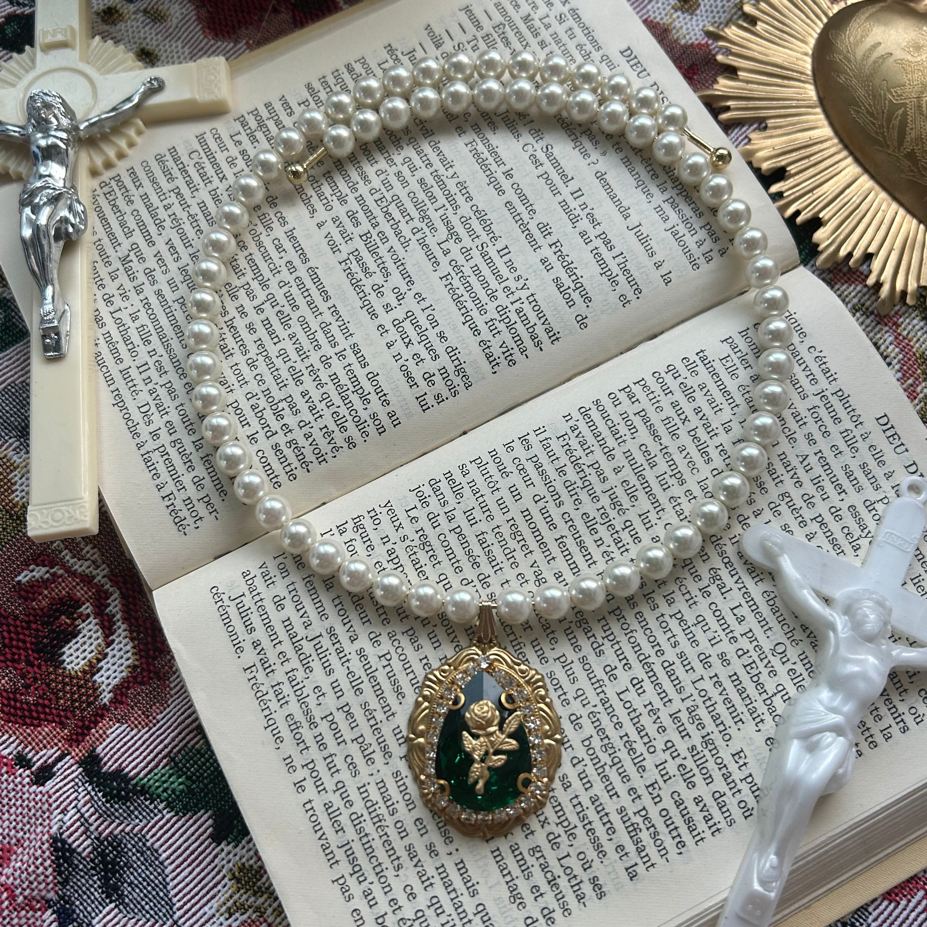 大きなジュエルに真鍮のバラをあしらったパールが美しいワイヤーチョーカーです