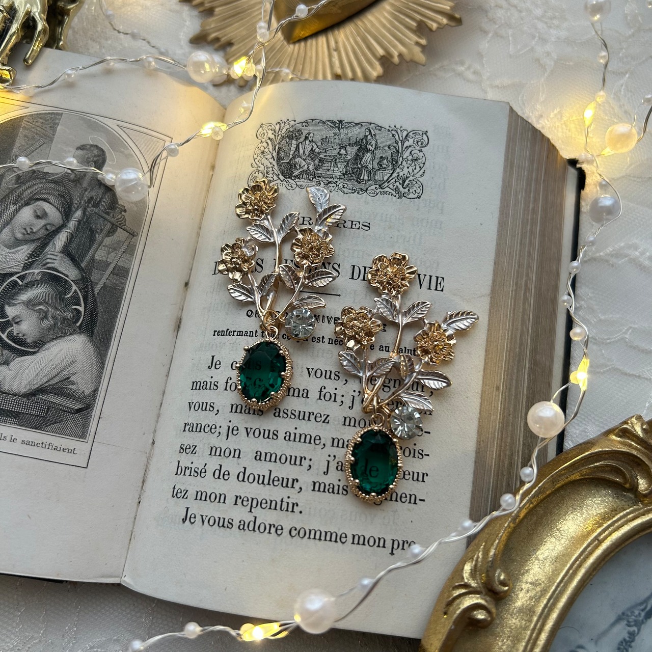 マリーゴールドとグリーンのガラスストーン揺れる耳飾りです